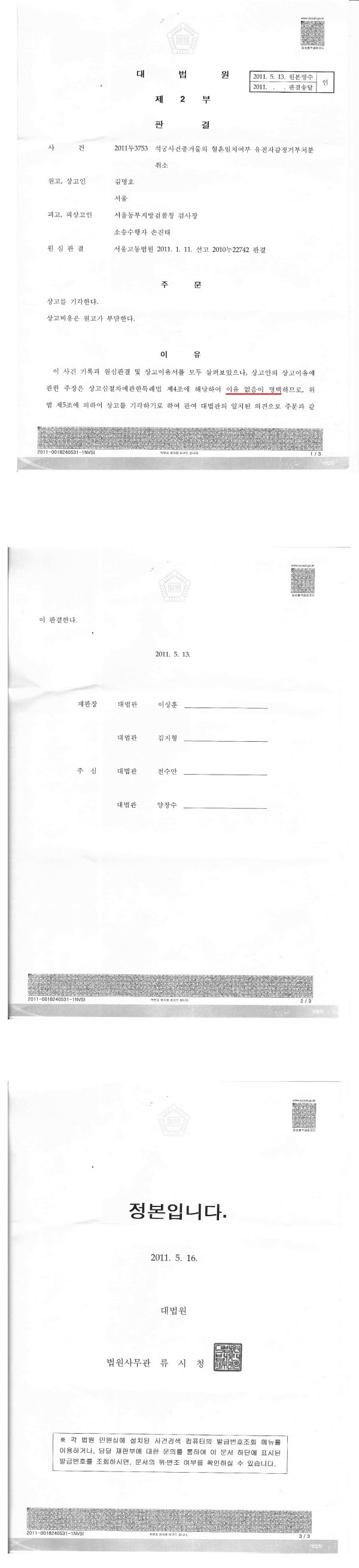 ③ 제3자인 대법원 경비대장전금식 시켜 나 김명호를 명예훼손으로 고발했고, 3사건들의 담당 검사는 신성식
