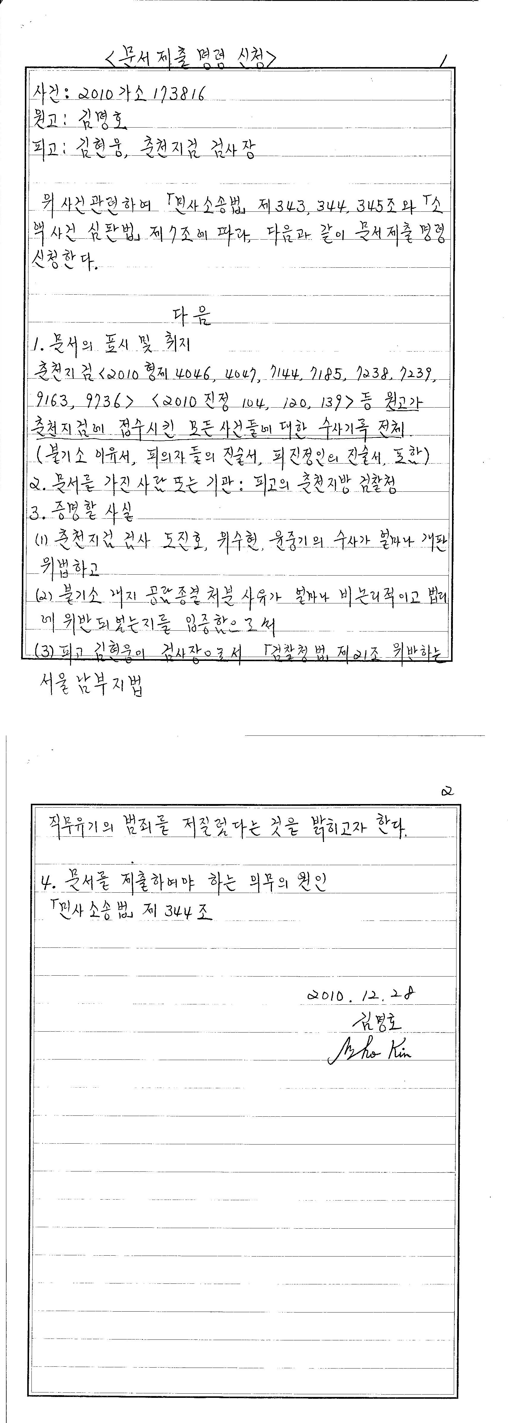 2. 원고는, 춘천지검의 위법한 수사들을 입증하기 위하여 춘천지검이 소지하고 있는 수사기록에 대한 문서제출 명령을 2010.12.31일 신청하였고, 2011.1.24일 문서제출명령독촉 신청까지 했다. 그 문서가 제출되면 그 안에 원고가 소장에서 주장한 것들이 모두 사실임이 입증된다. 이는 유일한 증거신청으로,