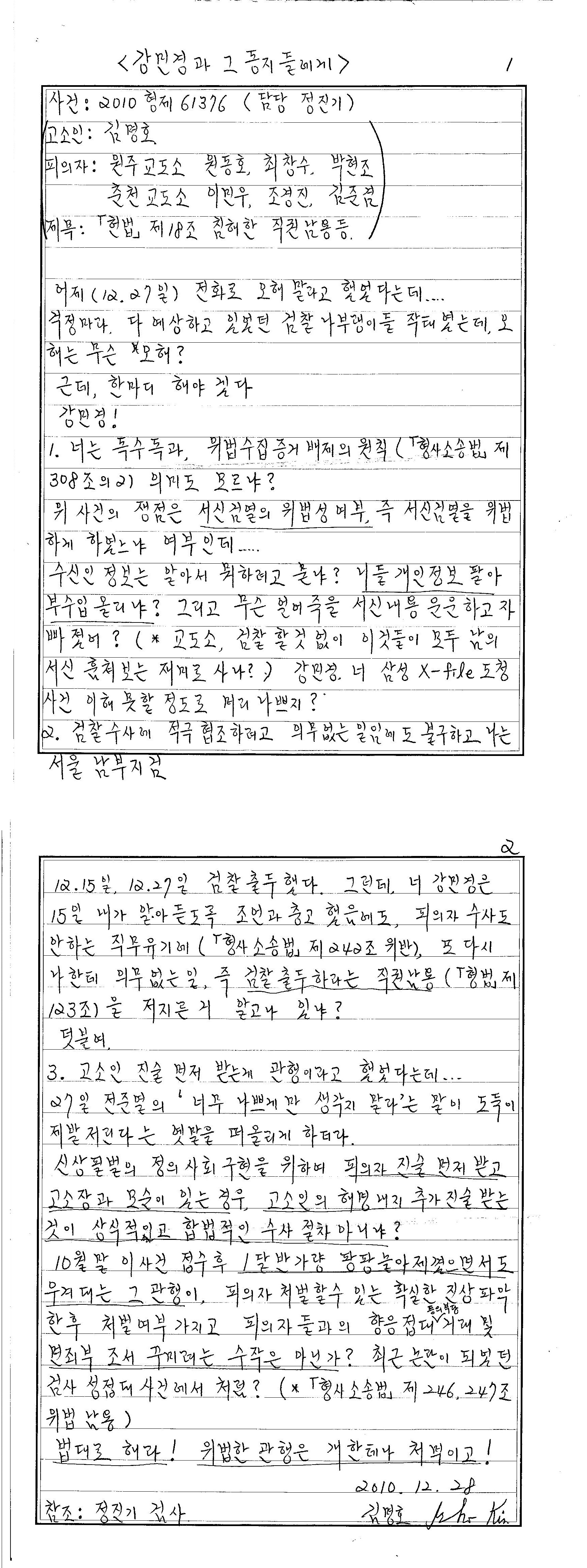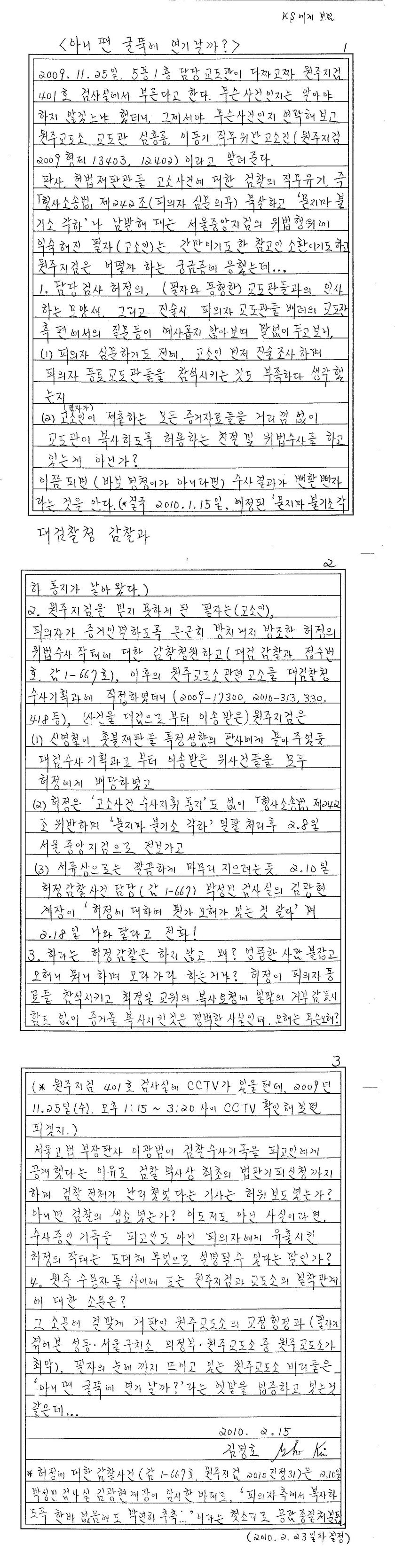 1. 춘천지검 2010형제7144, 2010형제4046, 4047, 2010진정104, 120, 139 사건에 대한 수사기록은, 피고 윤중기가 2010년 11.11일 제출한 답변서와 다름없이 ‘무조건 춘천교도소의 범죄행위는 옳다’ 일변도의 비논리적이고 법리도 없는 개판이다.