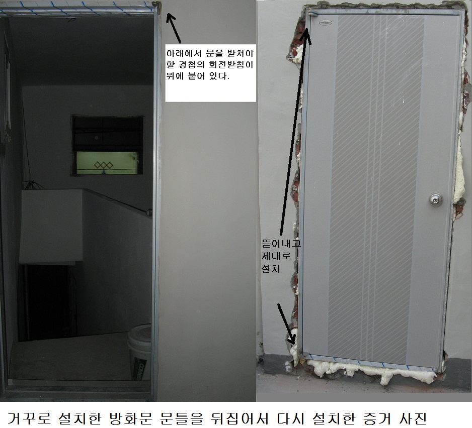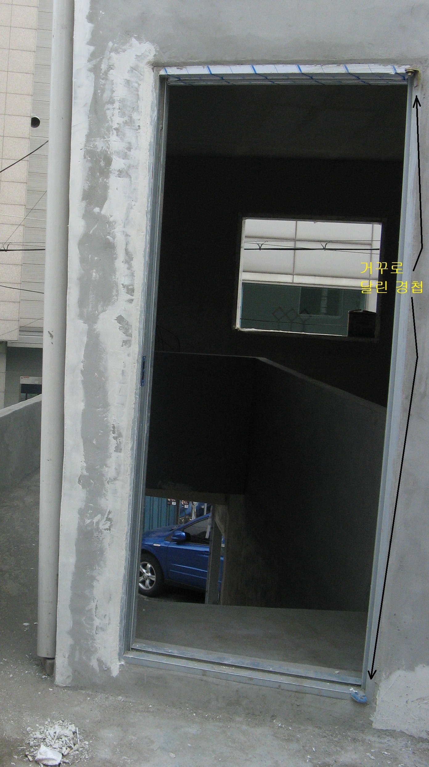 6. 방화문의 문틀만 설치되었기에 문을 달려고 시도해 보니 안된다. 이상해서 다른 문틀과 비교해 보니 거꾸로 달아 놓았다. 문틀에 시멘트로 미장한 것을 뜯어 내고 문틀의 위아래를 바꿔서 설치.
