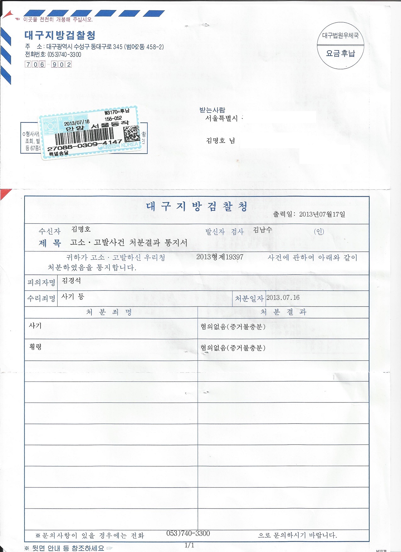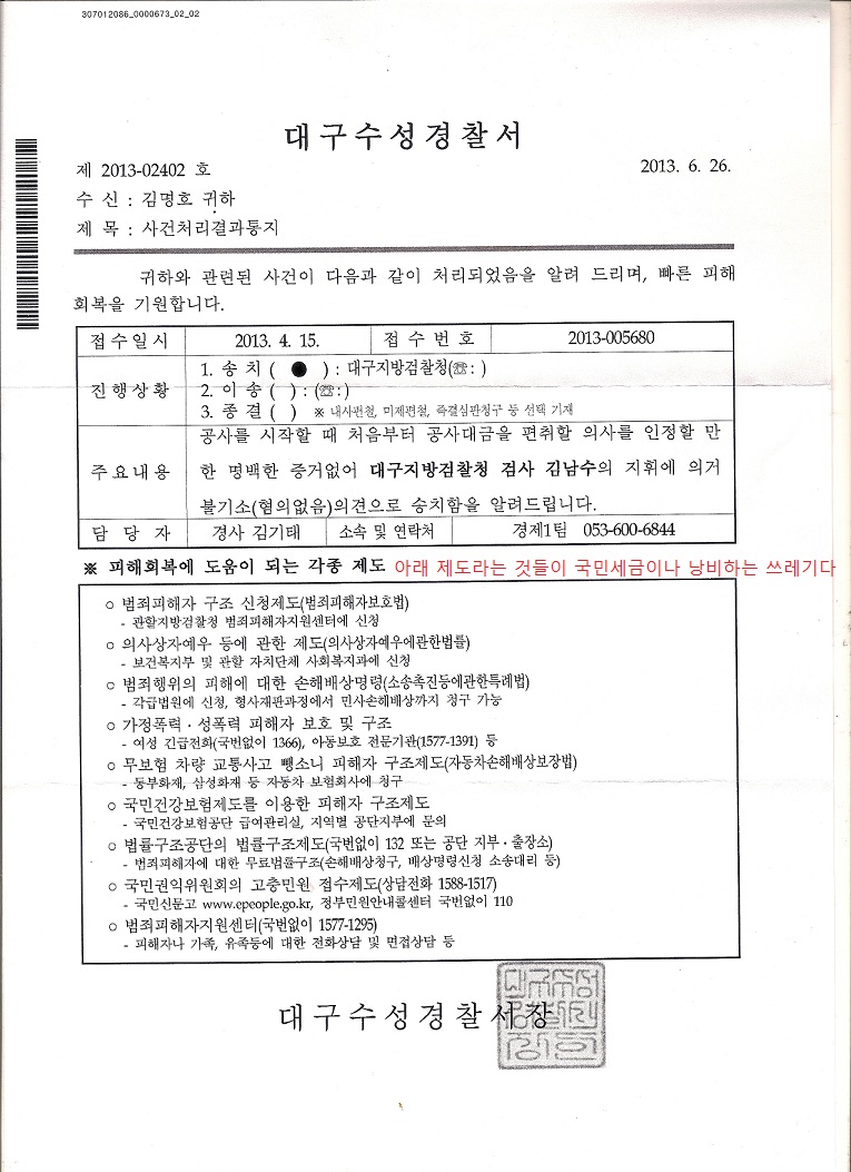 그 지랄을 떨더니 개만도 못한 김남수 검사새끼의 특별지시를 받았는지, 불기소 통지.