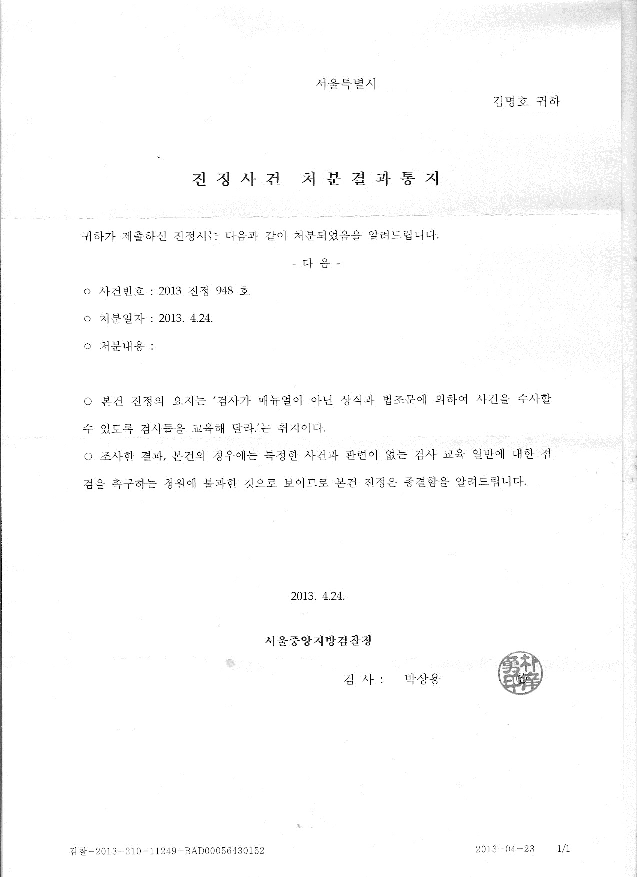 예상한 대로, 3.19일 '증거불충분'이라는 개소리로 불기소 처분(서울중앙지검 2013형제19071, 3.21일 수령).
