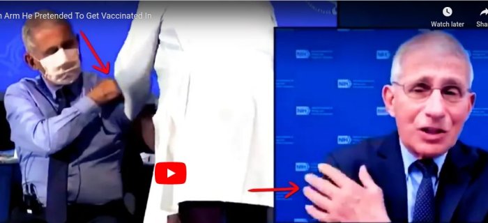 영상에서 보듯 왼쪽 팔에 백신 맞는 쇼를 연출했는데, 파우치 사기꾼은 백신 맞아 약간 쑤신다며 오른 팔을 두드린다