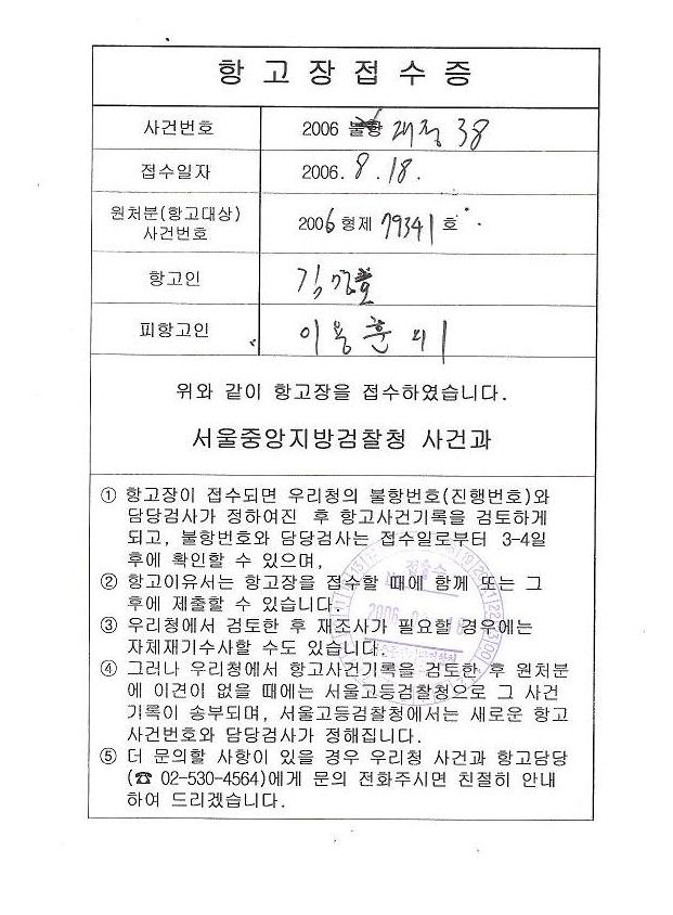 항고장을 5월 18일 제출하였습니다. 그에 대하여, 박홍우 판사는 5월 26일 항고 대상이 아니라고 하며 각하신청을 한 것입니다.