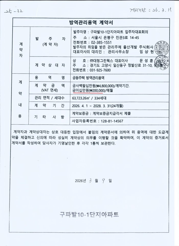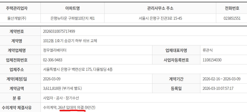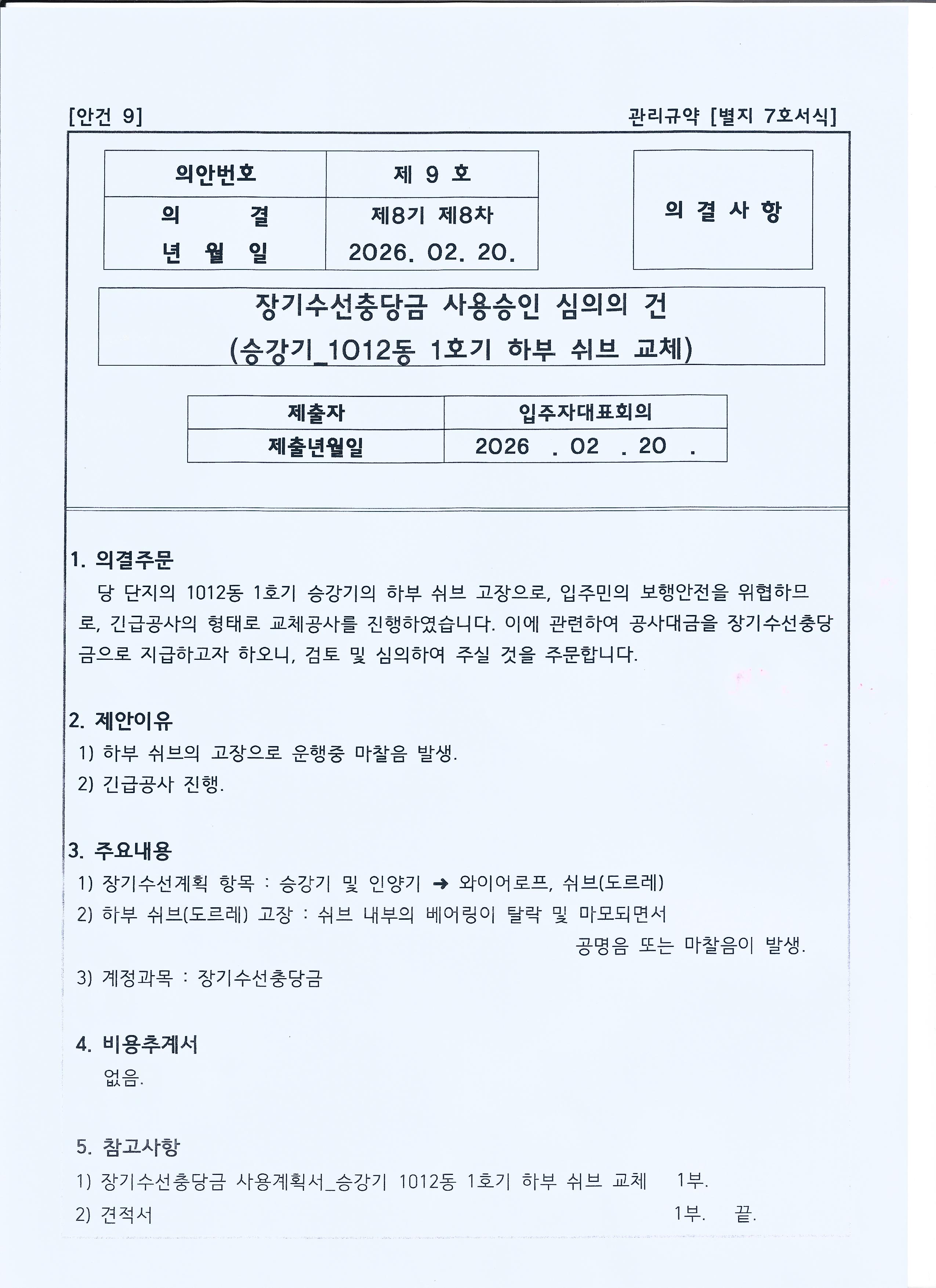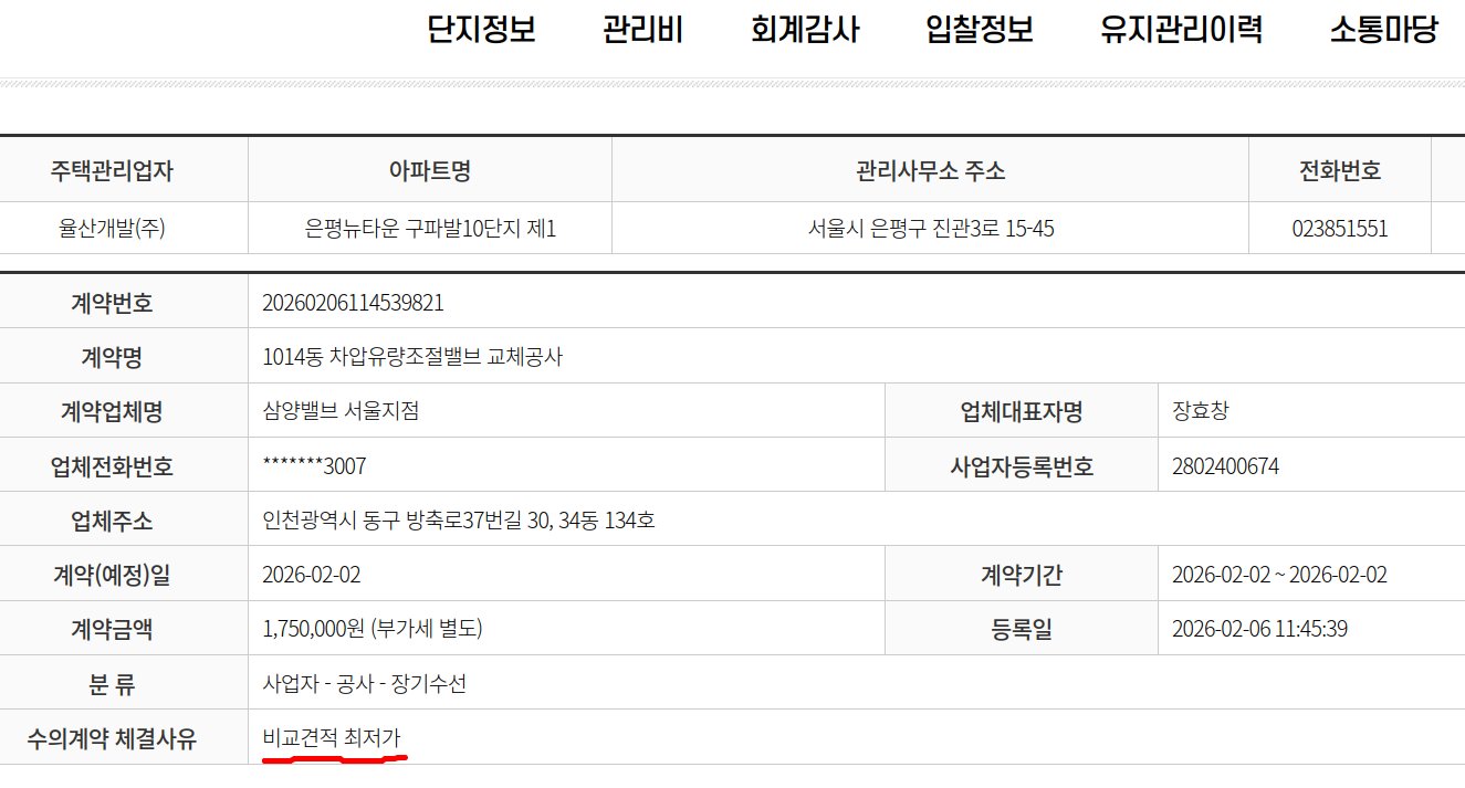 2.2일 교체한 후 2.20일 입주자 대표회의에서 비교 견적 최저가라 사기치며 수의계약 의결