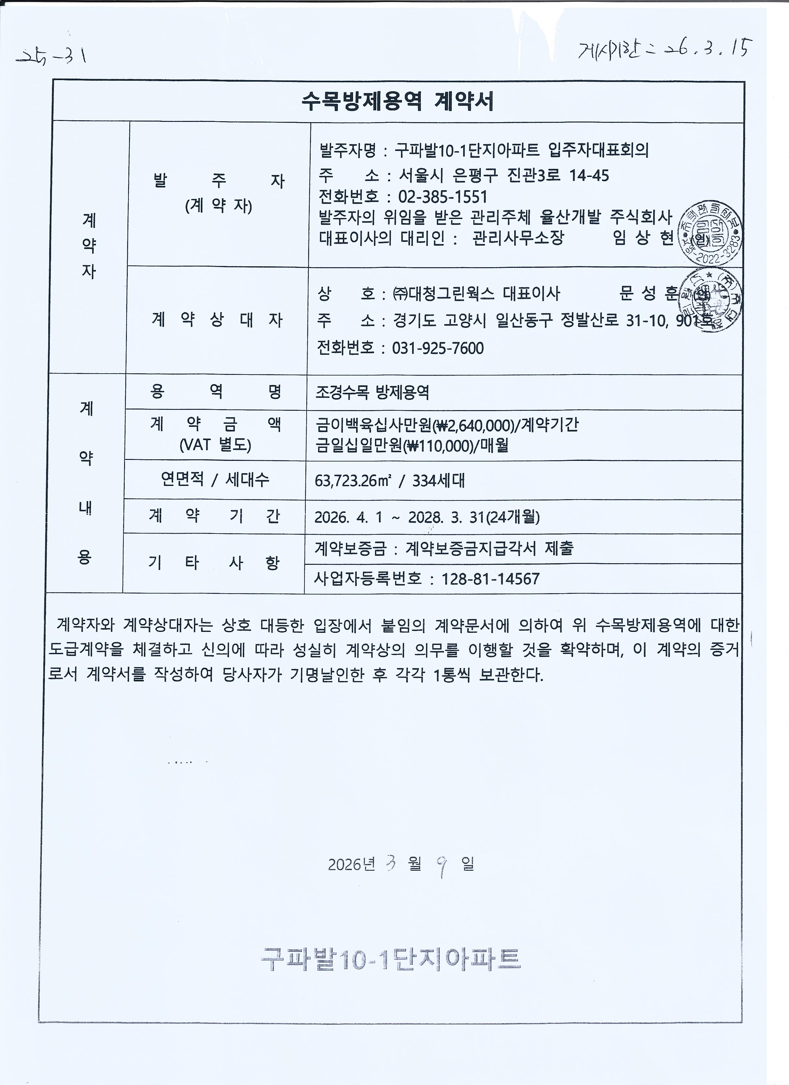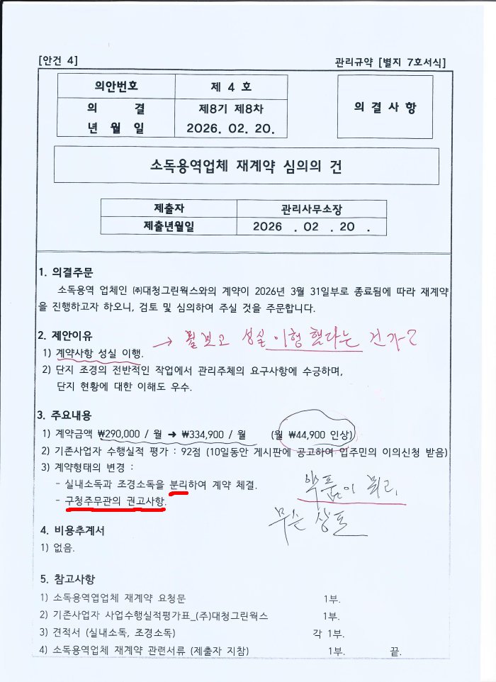 지난 2.20일 입주자 대표회의에, 대청그린웍스의 기존계약(방역관리+수목방제) 재계약 의결주문하면서 방역관리와 수목방제를 "분할" 계약하겠다며 임상현이 제출한 [안건4](자료1, 자료2)에 의하면