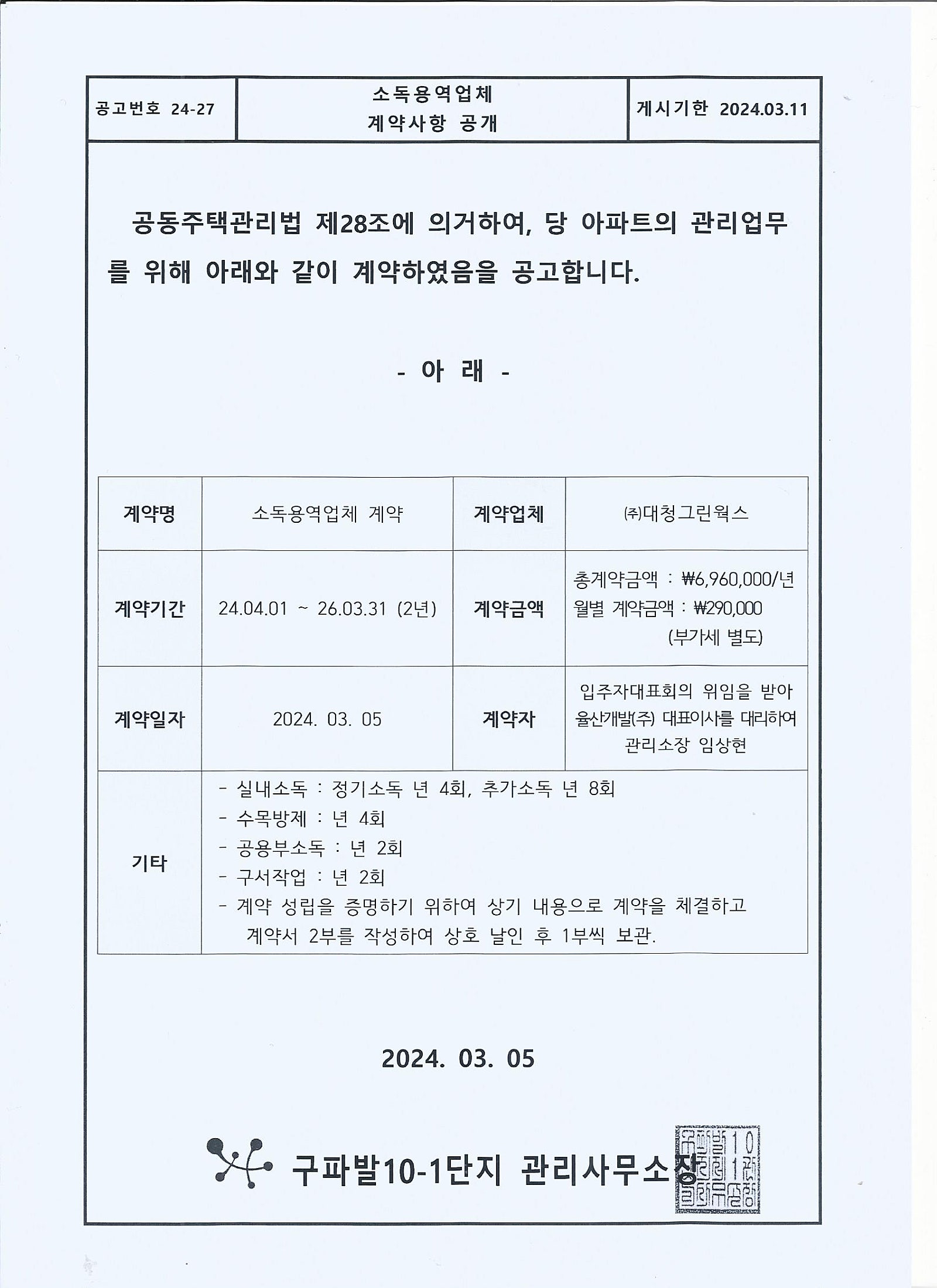 ③ 주택관리업자 및 사업자 선정지침 제4조 제3항 위반: 수의계약 이유를 "입주자대표회의 의결"이라고 기재하였는데(자료4), 수의계약 대상(자료5)에는 그에 해당되는 경우가 없을 뿐만 아니라 [공동주택 관리법] 제90조에서 명백하게 금지하고 있는 "관리소장과 입주자대표회의 공모" 스스로 자백한 것.