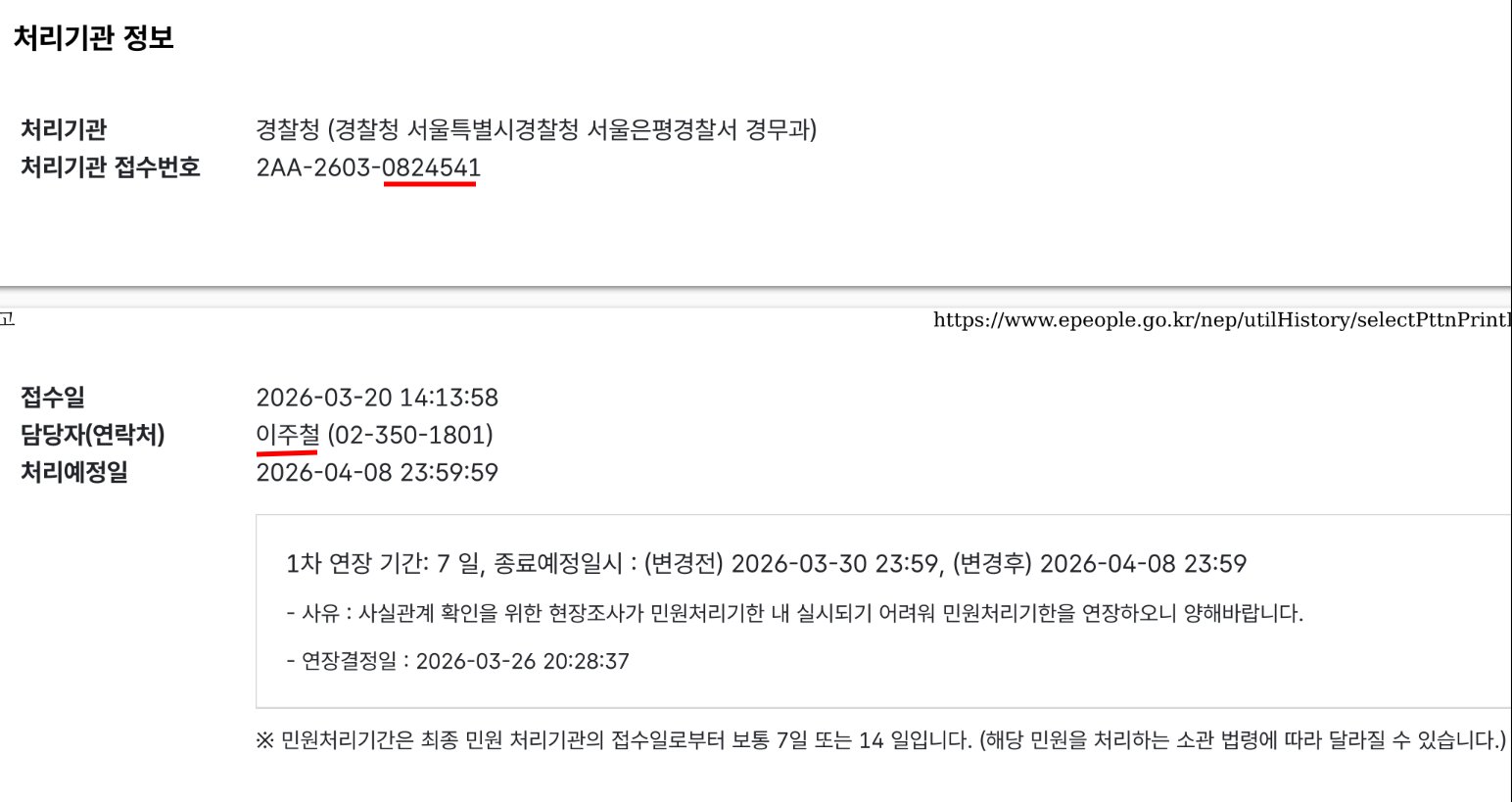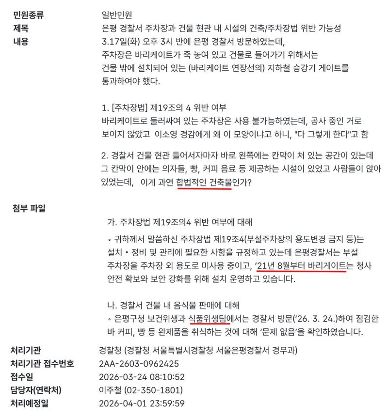 고소인은, 2026.3.19일 은평경찰서의 [주차장법] 위반과 불법 건축물에 대하여, 서울시경찰청에 국민신문고로 신고하였고(1AA-2603-0768486) 청문감사인권담당관 소속 오승표가 처리담당으로 배정되었는데,