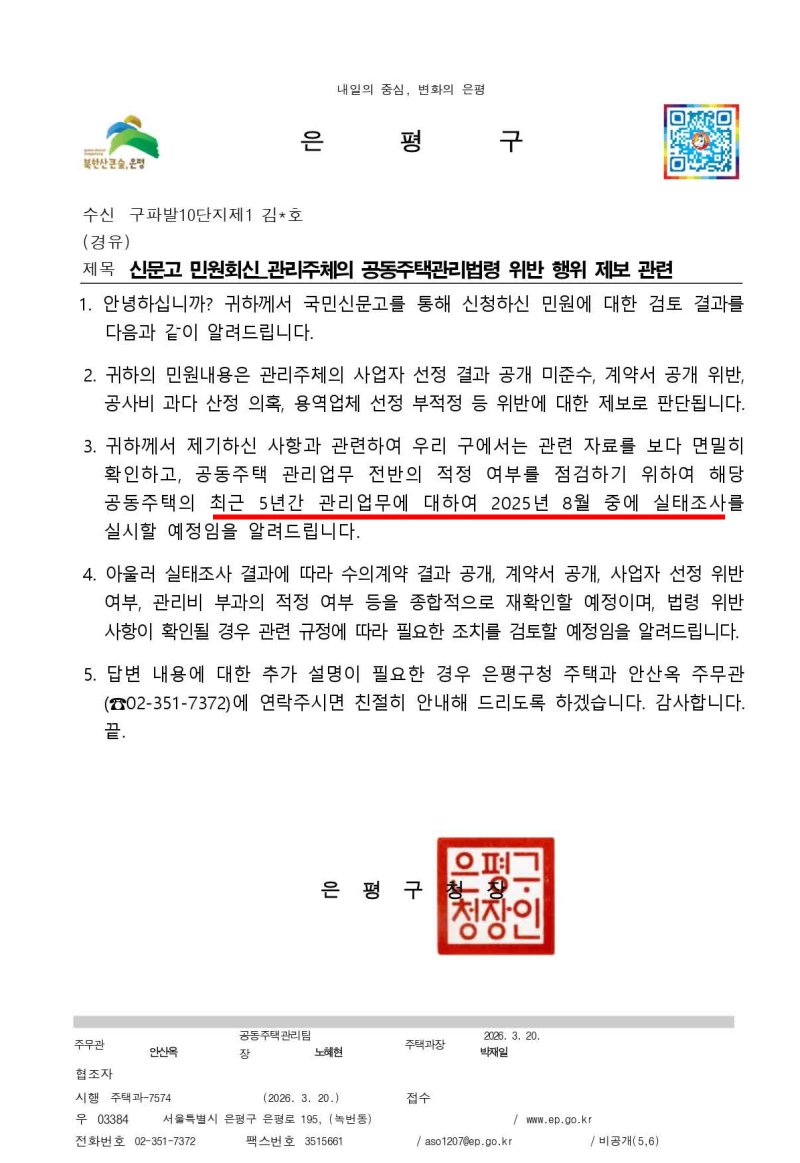 [공동주택 관리법] 제93조의 2 위반하며 "은평구 비리 신고"를 부득부득 은평구로 이송하여