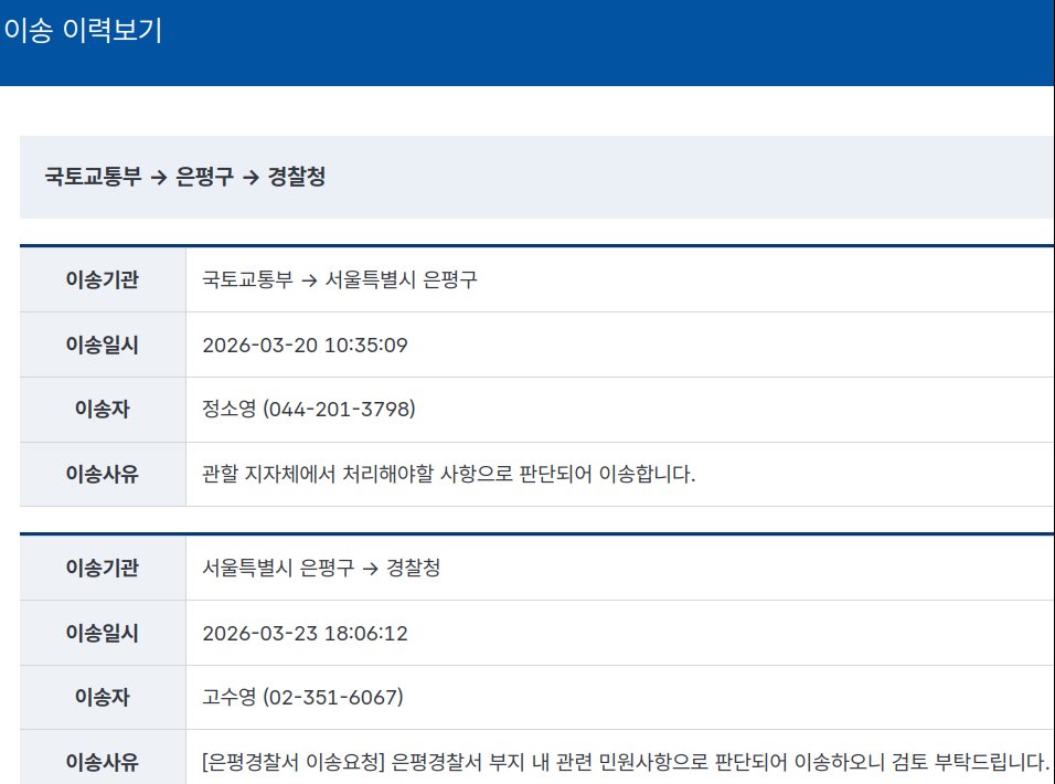 국토교통부가 은평구로 이송함으로써, 썩어빠진 은평구청과 은평경찰에 의하여 묵살된 전력이 있었고