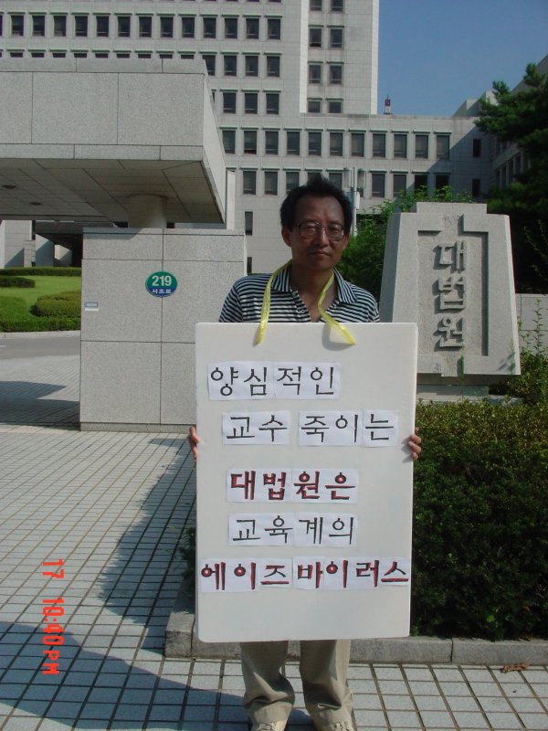 김씨는 7월18일부터 부당재임용 탈락 교수협의회 교수들과 함께 공정한 재판을 요구하며 대법원 앞에서 1인 시위를 벌이고 있다.