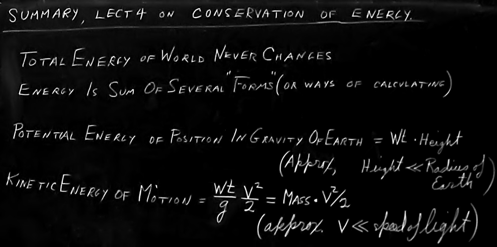 We must get a formula for the energy of motion. Now, recalling our arguments about reversible machines, we can easily see that in the motion at the bottom must be a quantity of energy which permits it to rise a certain height, and which has nothing to do with the machinery by which it comes up or the path by which it comes up. So we have an equivalence formula something like the one we wrote for the child’s blocks. We have another form to represent the energy. It is easy to say what it is. The kinetic energy at the bottom equals the weight times the height that it could go, corresponding to its velocity: $\text{K.E.}= WH$. What we need is the formula which tells us the height by some rule that has to do with the motion of objects. If we start something out with a certain velocity, say straight up, it will reach a certain height; we do not know what it is yet, but it depends on the velocity—there is a formula for that. Then to find the formula for kinetic energy for an object moving with velocity $V$, we must calculate the height that it could reach, and multiply by the weight. We shall soon find that we can write it this way: \begin{equation} \label{Eq:I:4:6} \text{K.E.}=WV^2/2g. \end{equation} Of course, the fact that motion has energy has nothing to do with the fact that we are in a gravitational field. It makes no difference where the motion came from. This is a general formula for various velocities. Both (4.3) and (4.6) are approximate formulas, the first because it is incorrect when the heights are great, i.e., when the heights are so high that gravity is weakening; the second, because of the relativistic correction at high speeds. However, when we do finally get the exact formula for the energy, then the law of conservation of energy is correct.