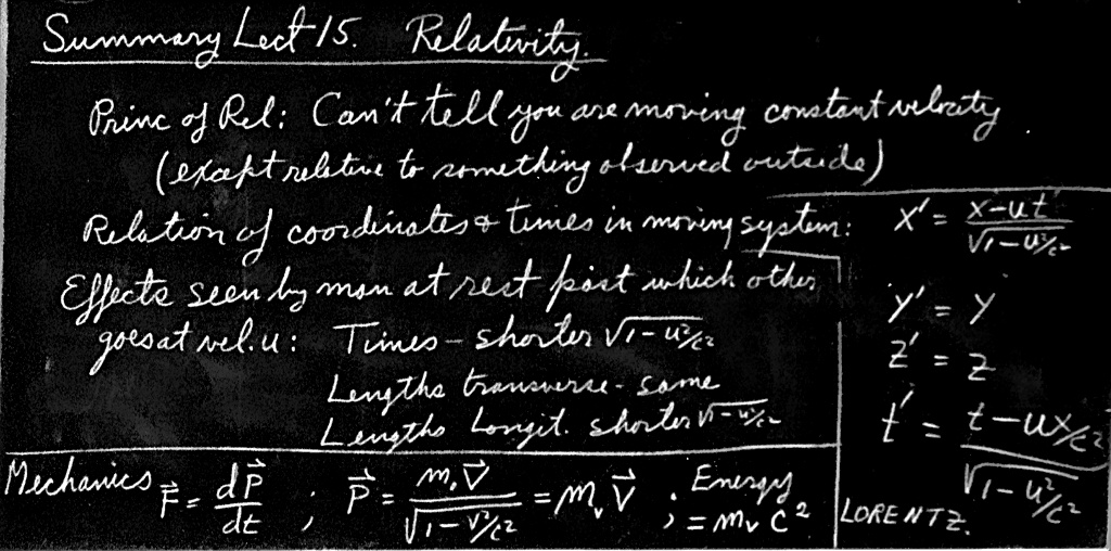 The principle of relativity was first stated by Newton, in one of his corollaries to the laws of motion: “The motions of bodies included in a given space are the same among themselves, whether that space is at rest or moves uniformly forward in a straight line.” This means, for example, that if a space ship is drifting along at a uniform speed, all experiments performed in the space ship and all the phenomena in the space ship will appear the same as if the ship were not moving, provided, of course, that one does not look outside. That is the meaning of the principle of relativity. This is a simple enough idea, and the only question is whether it is true that in all experiments performed inside a moving system the laws of physics will appear the same as they would if the system were standing still. Let us first investigate whether Newton’s laws appear the same in the moving system.