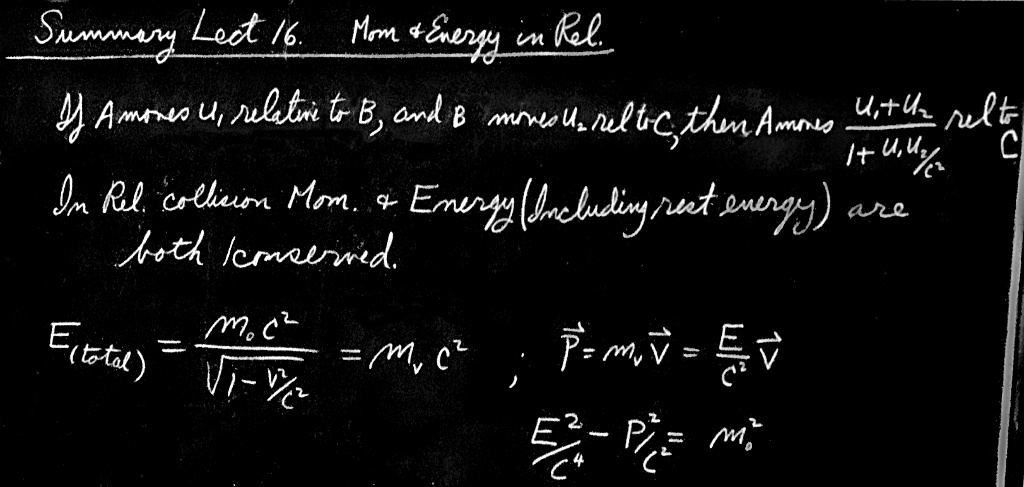 Finally, we find that the velocity $v$, momentum $P$, and total energy $E$ are related in a rather simple way. That the mass in motion at speed $v$ is the mass $m_0$ at rest divided by $\sqrt{1 - v^2/c^2}$, surprisingly enough, is rarely used. Instead, the following relations are easily proved, and turn out to be very useful: \begin{equation} \label{Eq:I:16:13} E^2-P^2c^2=m_0^2c^4 \end{equation} and \begin{equation} \label{Eq:I:16:14} Pc=Ev/c. \end{equation}
