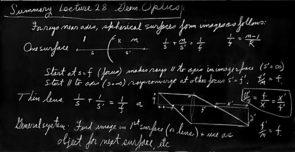 We see an interesting thing: if we divide each focal length by the corresponding index of refraction we get the same result! This theorem, in fact, is general. It is true of any system of lenses, no matter how complicated, so it is interesting to remember. We did not prove here that it is general—we merely noted it for a single surface, but it happens to be true in general that the two focal lengths of a system are related in this way. Sometimes Eq. (27.3) is written in the form \begin{equation} \label{Eq:I:27:6} 1/s+n/s'=1/f. \end{equation} This is more useful than (27.3) because we can measure $f$ more easily than we can measure the curvature and index of refraction of the lens: if we are not interested in designing a lens or in knowing how it got that way, but simply lift it off a shelf, the interesting quantity is $f$, not the $n$ and the $1$ and the $R$!