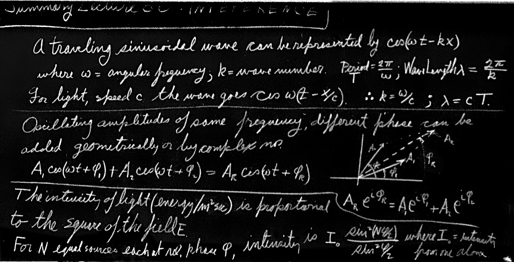 Thus the sum of the two effects has the intensity $A_1^2$ we would get with one of them alone, plus the intensity $A_2^2$ we would get with the other one alone, plus a correction. This correction we call the interference effect(* 빠뜨린 실제 상황). It is really only the difference between what we get simply by adding the intensities, and what actually happens. We call it interference whether it is positive or negative. (Interference in ordinary language usually suggests opposition or hindrance, but in physics we often do not use language the way it was originally designed!) If the interference term is positive, we call that case constructive interference, horrible though it may sound to anybody other than a physicist! The opposite case is called destructive interference.