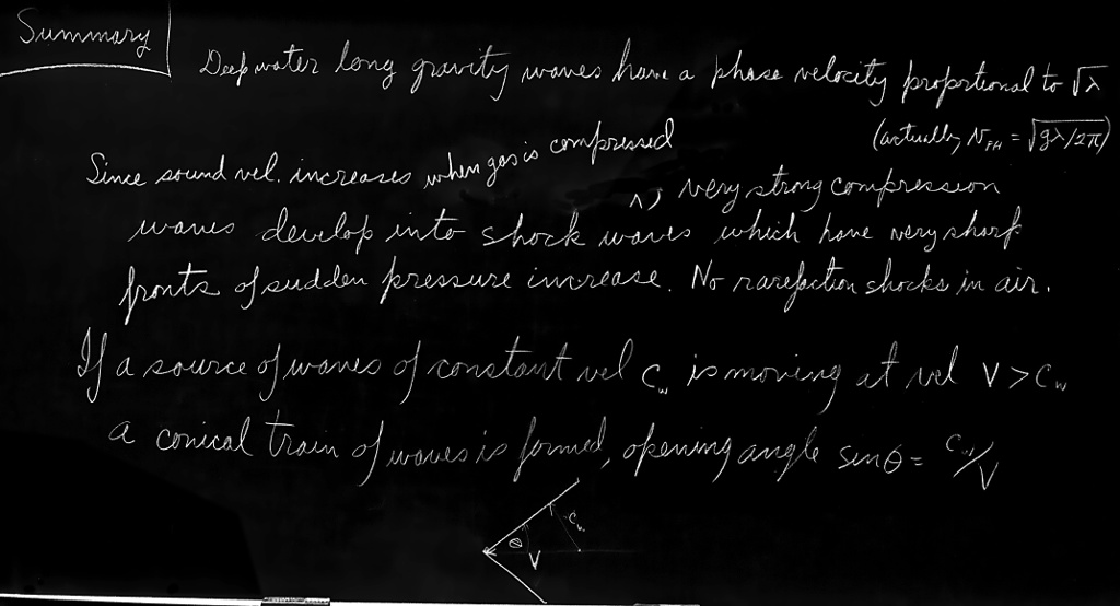 Now, referring again to Fig. 51–2, we see that the curvature can be understood if we appreciate that the pressures near the apex are higher than they are farther back, and so the angle $\theta$ is greater. That is, the curve is the result of the fact that the speed depends upon the strength of the wave. Therefore the wave from an atomic bomb explosion travels much faster than the speed of sound for a while, until it gets so far out that it is weakened to such an extent from spreading that the pressure bump is small compared with atmospheric pressure. The speed of the bump then approaches the speed of sound in the gas into which it is going. (Incidentally, it always turns out that the speed of the shock is higher than the speed of sound in the gas ahead, but is lower than the speed of sound in the gas behind. That is, impulses from the back will arrive at the front, but the front rides into the medium in which it is going faster than the normal speed of signals. So one cannot tell, acoustically, that the shock is coming until it is too late. The light from the bomb arrives first, but one cannot tell that the shock is coming until it arrives, because there is no sound signal coming ahead of it.)