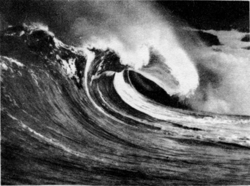 The speed of long waves in water with circulational motions is slower when the depth is less, faster in deep water. Thus as water comes toward a beach where the depth lessens, the waves go slower. But where the water is deeper, the waves are faster, so we get the effects of shock waves. This time, since the wave is not so simple, the shocks are much more contorted, and the wave over-curves itself, in the familiar way shown in Fig. 51–12. This is what happens when waves come into the shore, and the real complexities in nature are well revealed in such a circumstance. No one has yet been able to figure out what shape the wave should take as it breaks.