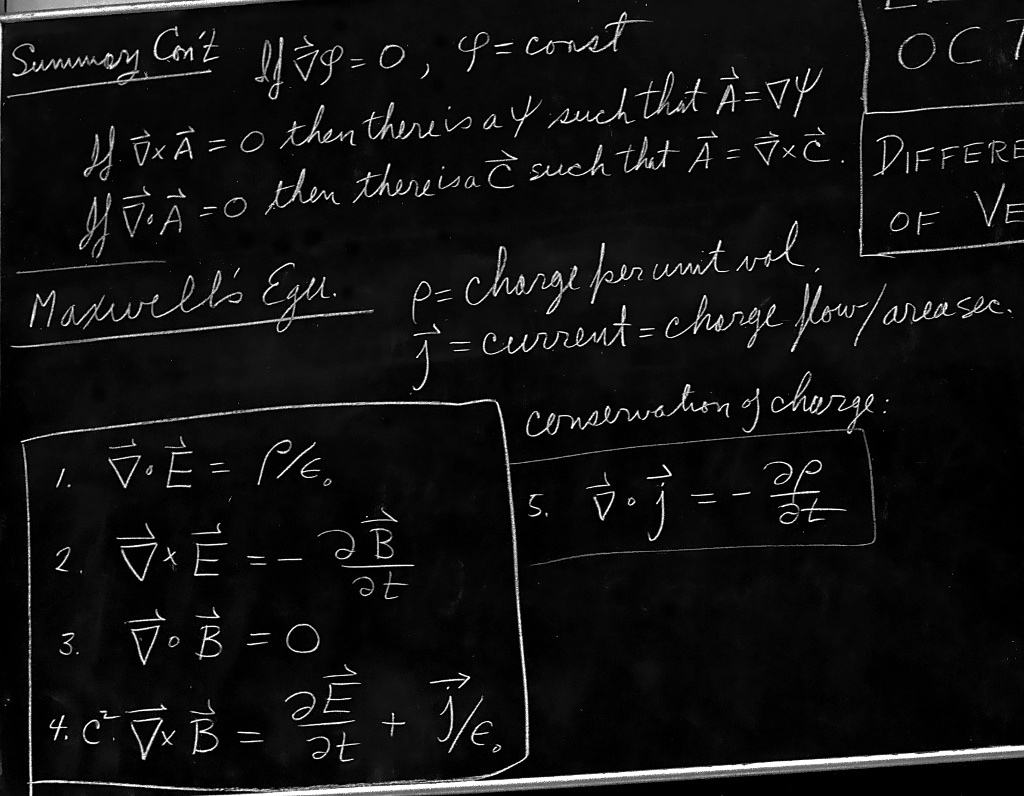As an example of the use of our vector differential operator $\FLPnabla$, we write a set of vector equations which contain the same laws of electromagnetism that we gave in words in Chapter 1. They are called Maxwell’s equations. \begin{gather} \notag \textit{Maxwell’s Equations}\\[1ex] \label{Eq:II:2:41} \begin{alignedat}{2} &(1)&\quad \FLPdiv{\FLPE}\;&=\frac{\rho}{\epsO}\\[.5ex] &(2)&\quad\FLPcurl{\FLPE}\;&=-\ddp{\FLPB}{t}\\[.5ex] &(3)&\quad\FLPdiv{\FLPB}\;&=0\\[.5ex] &(4)&\quad c^2\,\FLPcurl{\FLPB}\;&=\ddp{\FLPE}{t}+\frac{\FLPj}{\epsO} \end{alignedat} \end{gather} where $\rho$ (rho), the “electric charge density,” is the amount of charge per unit volume, and $\FLPj$, the “electric current density,” is the rate at which charge flows through a unit area per second. These four equations contain the complete classical theory of the electromagnetic field. You see what an elegantly simple form we can get with our new notation!