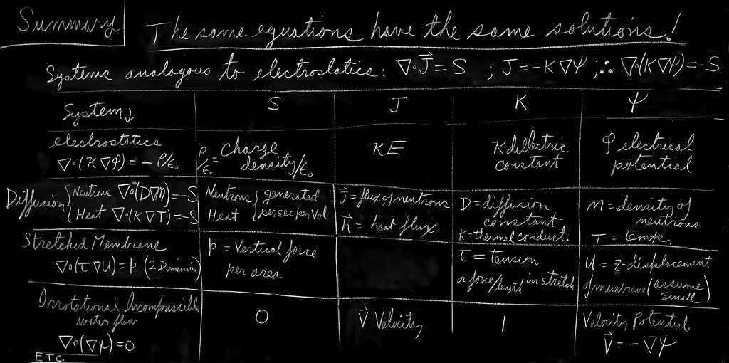 However, a question surely suggests itself at the end of such a discussion: Why are the equations from different phenomena so similar? We might say: “It is the underlying unity of nature.” But what does that mean? What could such a statement mean? It could mean simply that the equations are similar for different phenomena; but then, of course, we have given no explanation. The “underlying unity” might mean that everything is made out of the same stuff, and therefore obeys the same equations. That sounds like a good explanation, but let us think. The electrostatic potential, the diffusion of neutrons, heat flow—are we really dealing with the same stuff? Can we really imagine that the electrostatic potential is physically identical to the temperature, or to the density of particles? Certainly $\phi$ is not exactly the same as the thermal energy of particles. The displacement of a membrane is certainly not like a temperature. Why, then, is there “an underlying unity”?