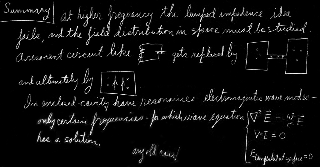 You will notice that in the original $L$-$C$ resonant circuit of Fig. 23–16 the electric and magnetic fields are quite separate. As we have gradually modified the resonant system to make higher and higher frequencies, the magnetic field has been brought closer and closer to the electric field until in the cavity resonator the two are quite intermixed.