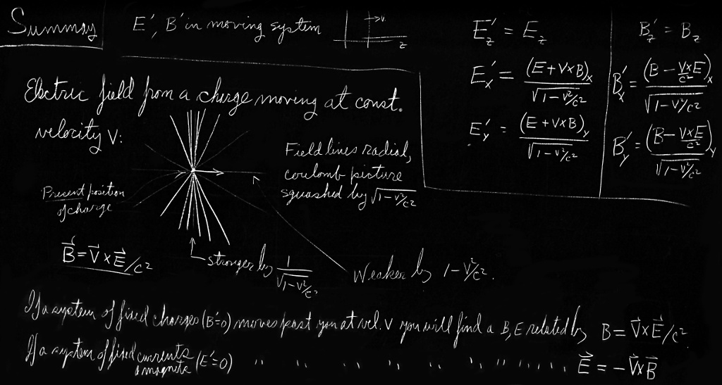You know, of course, that the moment that we have the formula for the potentials from a charge moving in any manner whatsoever, we have the complete electrodynamics; we can get the potentials of any charge distribution by superposition. Therefore we can summarize all the phenomena of electrodynamics either by writing Maxwell’s equations or by the following series of remarks. (Remember them in case you are ever on a desert island. From them, all can be reconstructed. You will, of course, know the Lorentz transformation; you will never forget that on a desert island or anywhere else.)