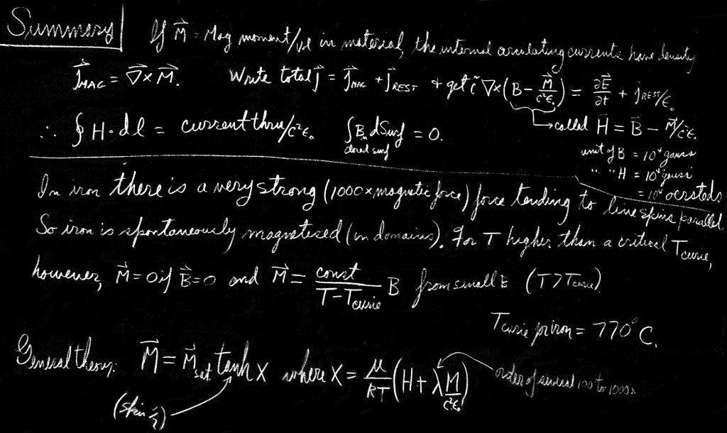In this chapter we will discuss some materials in which the net effect of the magnetic moments in the material is much greater than in the case of paramagnetism or diamagnetism. The phenomenon is called ferromagnetism. In paramagnetic and diamagnetic materials the induced magnetic moments are usually so weak that we don’t have to worry about the additional fields produced by the magnetic moments. For ferromagnetic materials, however, the magnetic moments induced by applied magnetic fields are quite enormous and have a great effect on the fields themselves. In fact, the induced moments are so strong that they are often the dominant effect in producing the observed fields. So one of the things we will have to worry about is the mathematical theory of large induced magnetic moments. That is, of course, just a technical question. The real problem is, why are the magnetic moments so strong—how does it all work? We will come to that question in a little while.