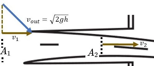 뉴튼의 법칙에 의해, 힘이 나오는 유일한 jet의 힘 $(\rho gh +p_0 -p_0)A_1$에 시간($\Delta t$)을 곱한 것으로 $\Delta M (v_2 - v_1)$와 같다.