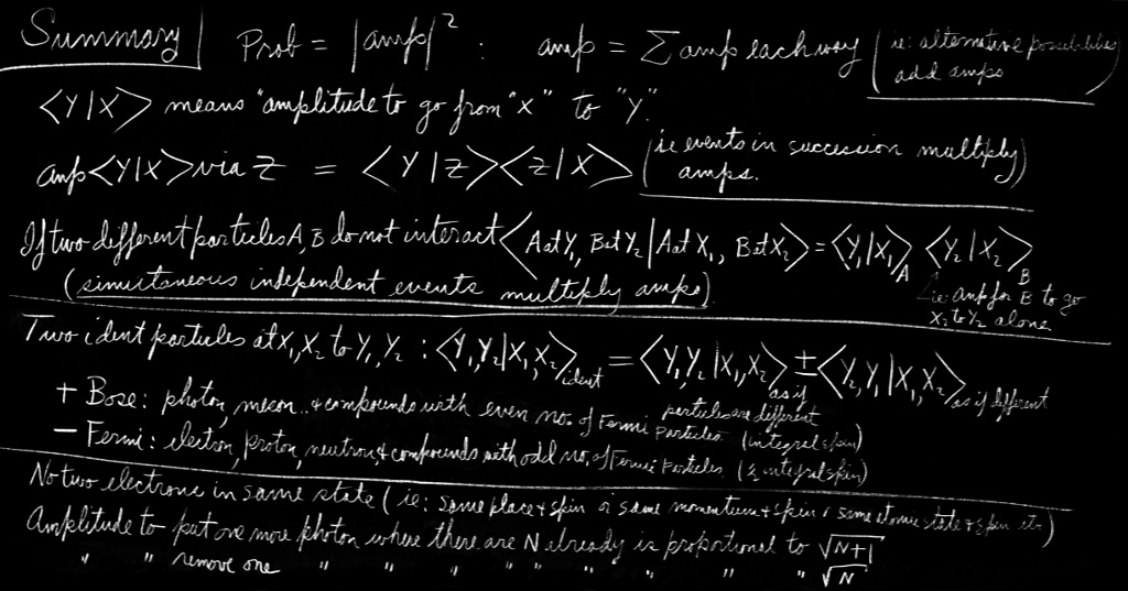 There is one more point to emphasize. Suppose that we didn’t know where the particles in Fig. 3–2 come from before arriving at holes $1$ and $2$ of the first wall. We can still make a prediction of what will happen beyond the wall (for example, the amplitude to arrive at $x$) provided that we are given two numbers: the amplitude to have arrived at $1$ and the amplitude to have arrived at $2$. In other words, because of the fact that the amplitude for successive events multiplies, as shown in Eq. (3.6), all you need to know to continue the analysis is two numbers—in this particular case $\braket{1}{s}$ and $\braket{2}{s}$. These two complex numbers are enough to predict all the future. That is what really makes quantum mechanics easy. It turns out that in later chapters we are going to do just such a thing when we specify a starting condition in terms of two (or a few) numbers. Of course, these numbers depend upon where the source is located and possibly other details about the apparatus, but given the two numbers, we do not need to know any more about such details.