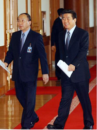 노무현 대통령이 국무회의 주재를 위해 김우식 비서실장과 회의장에 들어가고 있다.