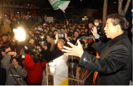 2002년 대선 당시 노무현 후보가 서울역 광장에서 야간유세를 갖고 지지를 호소하고 있다.