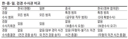검찰의 1차 직접 수사 범위는 부패범죄, 경제·금융범죄, 공직자범죄, 선거범죄 등 일부 특별수사 사건으로 제한한다. 이 중 상당수는 공수처가 신설되면 이관될 사건인데다 내란 등 주요 공안사건과 연쇄 살인 등 종전에 검경이 합동 수사를 해온 사건 등은 아예 포함되지 않는다. 현재 한국과 일본 모두 검경은 각각 '모든 범죄'를 수사할 수 있다. 중국만 검찰 수사 대상을 '특정범죄(공무원 직무 범죄)'로 제한하고 있다.