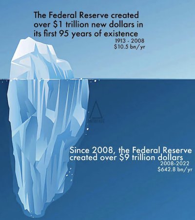 * 2022.5-6 인플레이션 자료 : 미국 연방은행이 사기업으로 발족된 이후 2008년까지 95년간 1조 달러를 찍어냈는데, 그 이후 15년간 9조 달러 넘게 찍어냈단다, 휴지처럼.