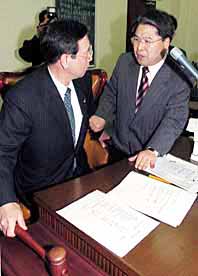 사진/ 이규택 총부(왼쪽)는 당론을 관철하기 위해 몸을 아끼지 않는 모습도 여러 번 보였다. 2001년 114월 당시 국회 교육위원장이던 그는 교육공무원법 개정안을 강행처리했다. (한겨레 이종근 기자)