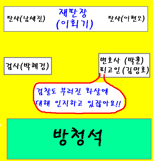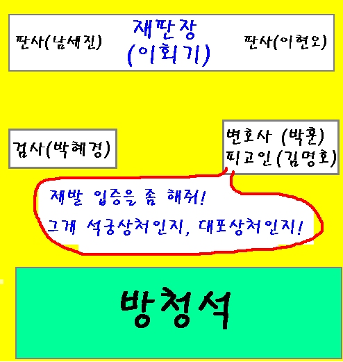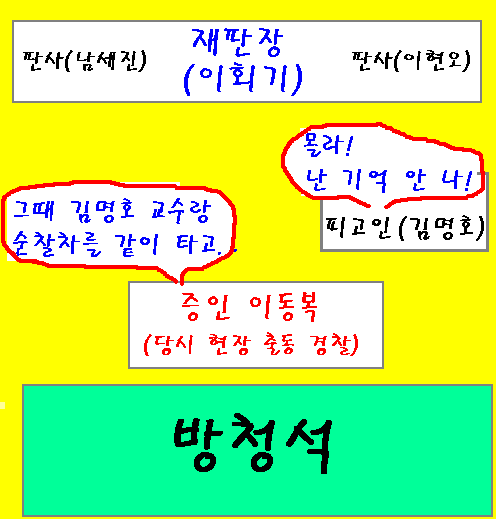 (이회기 재판장) 재판의 전 과정을 속기하고 녹음을 허가합니다. 전에 피고인 변호인 항소 이유서를 말했는데 (뭐라고 했냐면) 이 사건은 필요적 변호인 사건으로 변호인 출석하지 않고 개정 한 다음에 증거조사하고 결심하고 판결 선고 했다. 따라서 원심 판결은 피고인 방어건 침해라 무효다. 더 이상 심리 필요 없다고 ‘파기 환송’되야 한다. 그런데 그와 같은 항소 이유서가 받아들여지지 않을 경우 예비적으로 항소이유서를 또 말했는데 원심은 피고인 (김명호) 유죄 인정하면서 피해자 박홍우의 진술을 유죄 증거로 채택했는데 그의 증언이 일관적이지 않다. 믿을 수 없다.