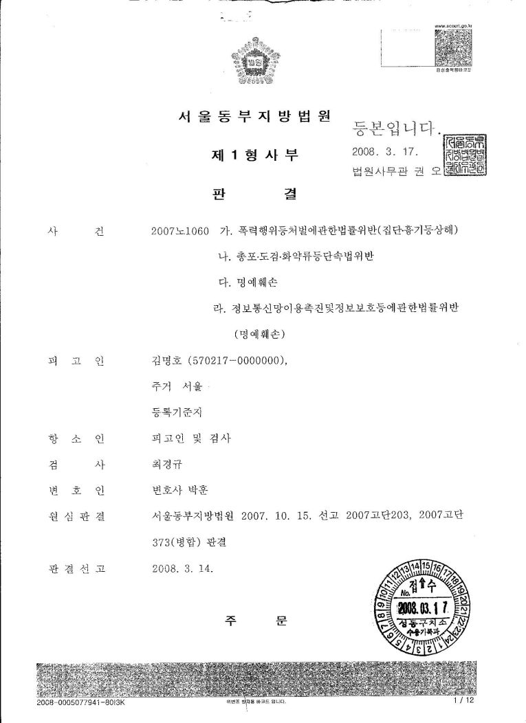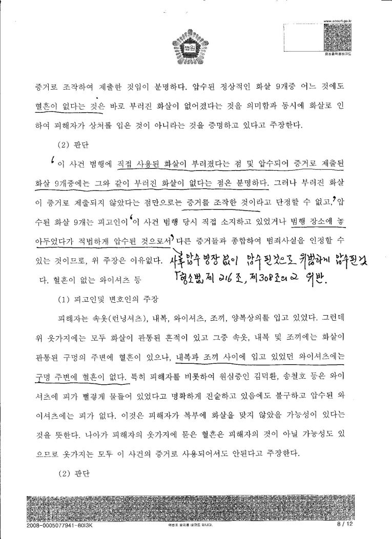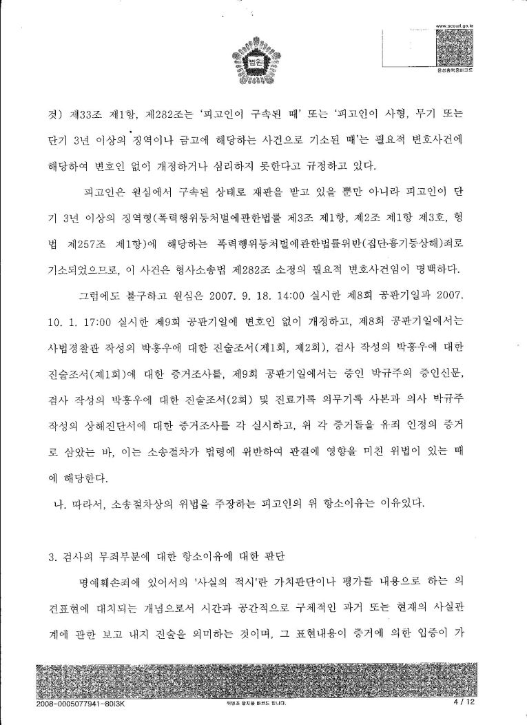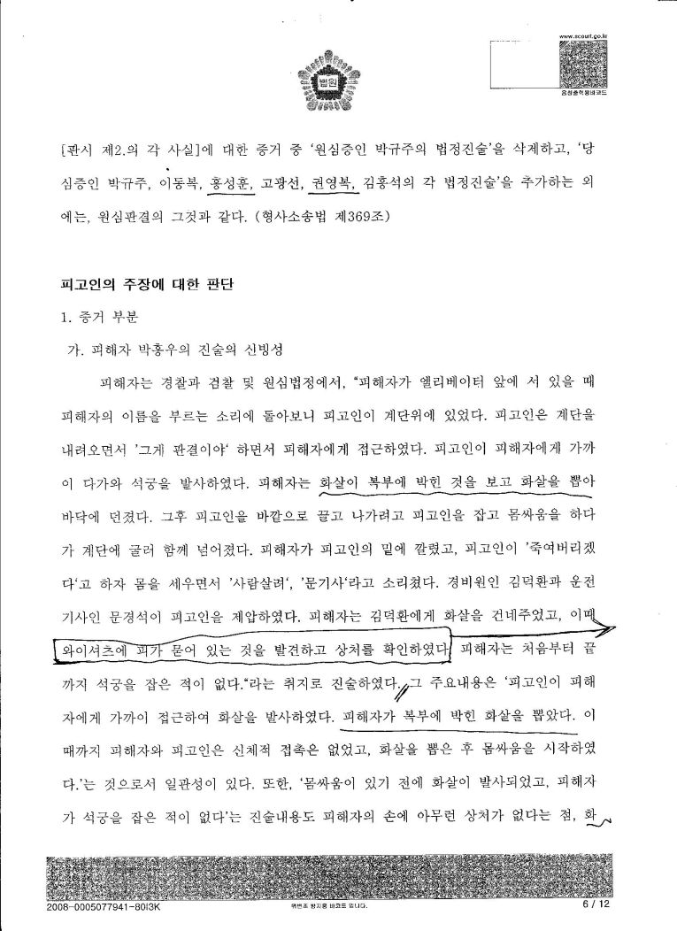| 상해 및 증거 | 전치 5주(진단서와 갈비뼈 골절의 방사선 사진) | 전치 3주(증거없음, 자해 덮은 사진) |