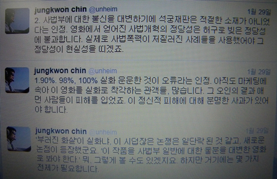 이런 면에서 저는 진중권씨가 이어지는 트위트에서 "사법부에 대한 불신을 대변하기에 석궁 재판은 적절한 소재가 아니었"고 "영화에서 얻어진 사법 개혁의 정당성은 허구로 빚은 정당성에 불과"하며 "실제로 사법 폭력이 저질러진 사례들을 사용했어야 그 정당성이 현실성을 띠겠"다고 한 대목이 안타깝습니다.