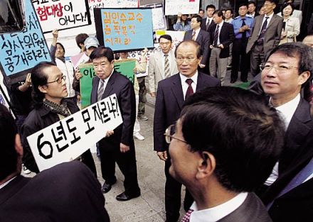 김민수 교수 복직요구 시위 18일 오전 국회 교육위의 서울대학교 국정감사에서 고교 등급제로 논란을 벌인 정운찬 총장(오른쪽 끝 안경 낀 사람)과 의원들이 점심식사를 하러 회의장을 나오자, 1998년 서울대 조교수 재임용에서 탈락해 6년째 복직투쟁을 벌이고 있는 김민수 전 교수(왼쪽 끝 안경 낀 사람)와 학생들이 복직을 요구하며 시위를 벌이고 있다.