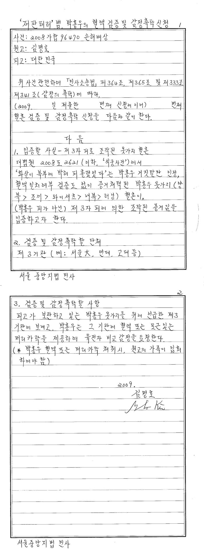 2009.10.07 원고 김명호 혈흔검증 및 감정신청 제출