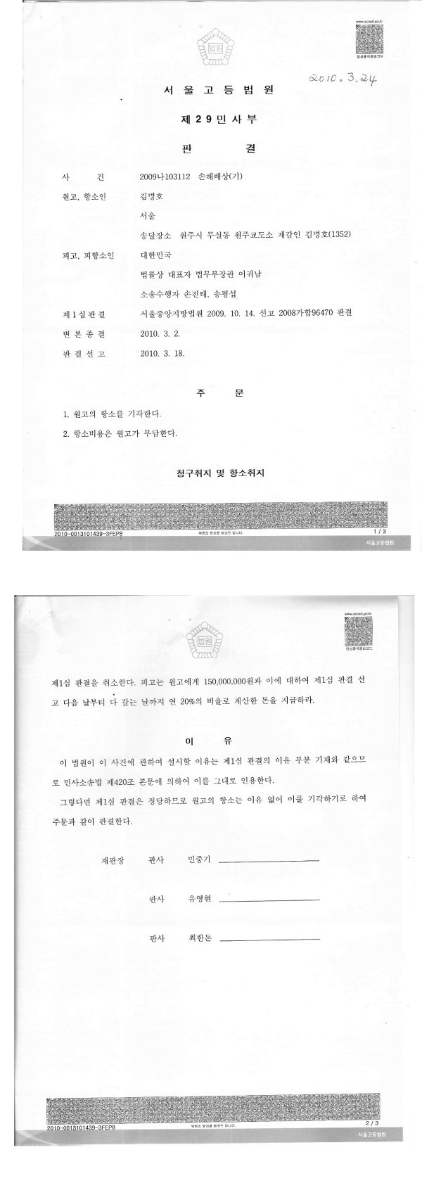 4. 원래, 이 사건의 재판장은 지영철이었는데, 이 놈은 재판은 열지 않고 쓰레기 석명준비명령을 날리며 시간을 끌더니 석궁사건 항소심 재판장 이회기처럼 2월 정기인사 때 사표쓰고 변호사가 되었다. 판사라는 것들이 석궁사건 관련 재판들을 맡지 않으려고 뺀질거리고 (사표쓸 용기없어) 죽지 못해 맡으면 법이고 뭐고 모조리 묵살하는 재판테러를 저질른다는 것.